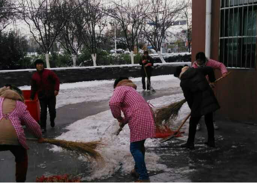 次日氣溫驟降,零下4度,多數路面存在結冰現象,加上路面落葉較多。天未亮,保潔、安保人員就到達園區(qū)公舍主干道、單元門、地庫出入口等指定區(qū)域,伴隨著凜冽的寒風,開始除雪化冰。對于他們來講,這注定又是忙碌的一天,經過2個小時緊張而有序的忙碌,基本完成了各個園區(qū)公舍各個路面、單元門、非機動車道、地庫出入口積雪的清掃工作。